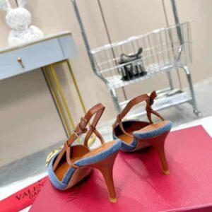 Denim and leather upper with leather sole and aged gold-tone hardware.